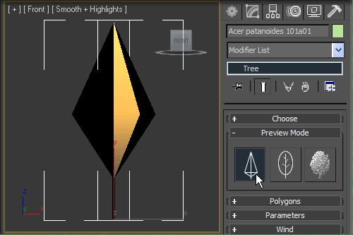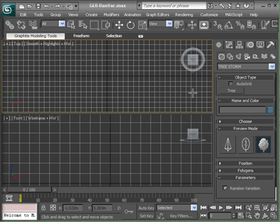 Once a tree has been positioned on the scene, you can change it by adjusting its random seed. Or, you can enable random variation in TREE STORM Parameters rolout prior to actual modeling and then proceed with the positioning. Just start by clicking the mouse in the top viewport and the trees are there - each slightly different from the previous one. This is ideal for building tree-lined streets, tree groves, and a forest.