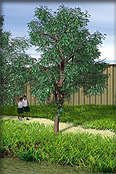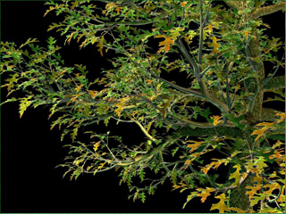 If you wish to texture map a real leaf onto the leaf objects, you can do that as well. Just specify the number of leaf sub-materials and replace the leaves with the "plates". TREE STORM will deliver a tree with the leaves grouped into the specified number of sub-materials. Each leaf will assume the form of a rectangular surface for easy texture mapping with Material Editor.