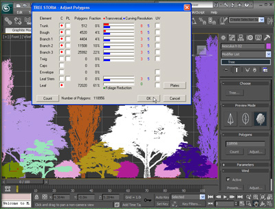 Besides extremely fast modeling, TREE STORM enables you to choose the detail and resolution of a tree prior to actual modeling. Also, once the tree is modeled in the scene, it takes just a moment to go back, adjust the detail and resolution of the tree, and remodel it again. You can even change this tree by adjusting its random seed, or replace it with another tree from the library.